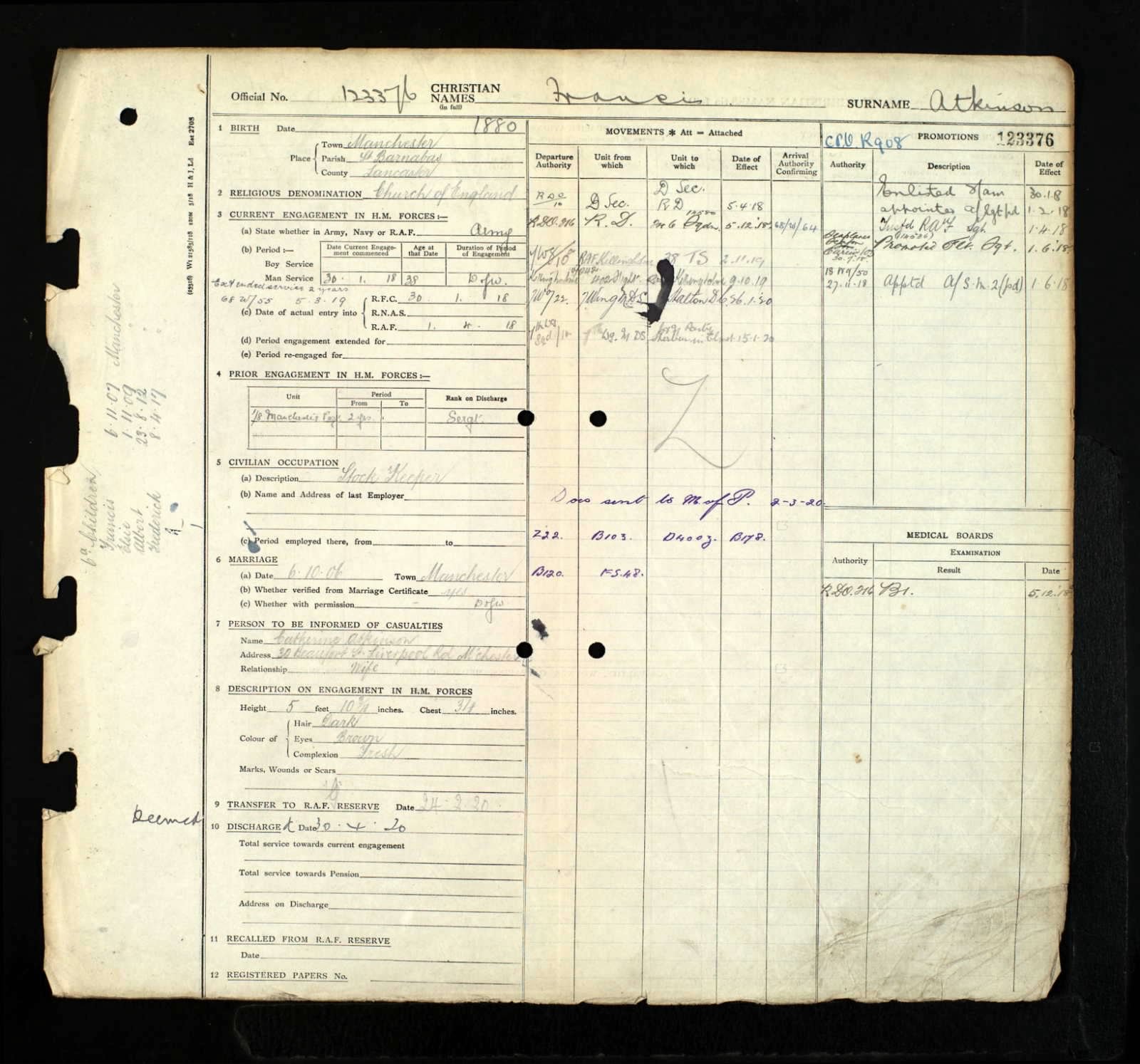 UK Royal Air Force Aimen Record 1918 - Francis Atkinson